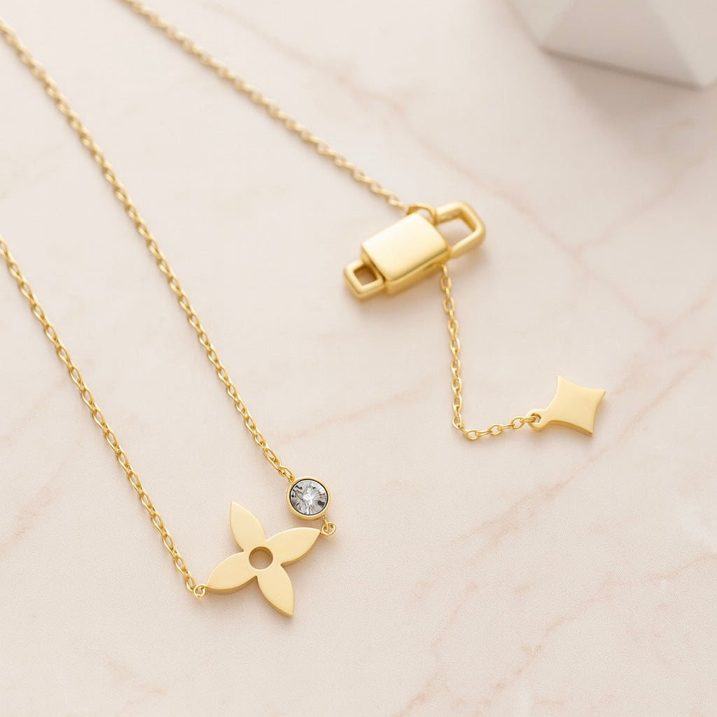 Féminin et délicat, le collier Florina séduit par son pendentif fleur stylisé accompagné d’un cristal éclatant. Sa chaîne fine dorée en acier inoxydable 316 plaqué or 18 carats lui assure une brillance durable et une résistance parfaite à l’eau et au temps. Un bijou raffiné à porter seul ou en superposition pour un look élégant et lumineux.