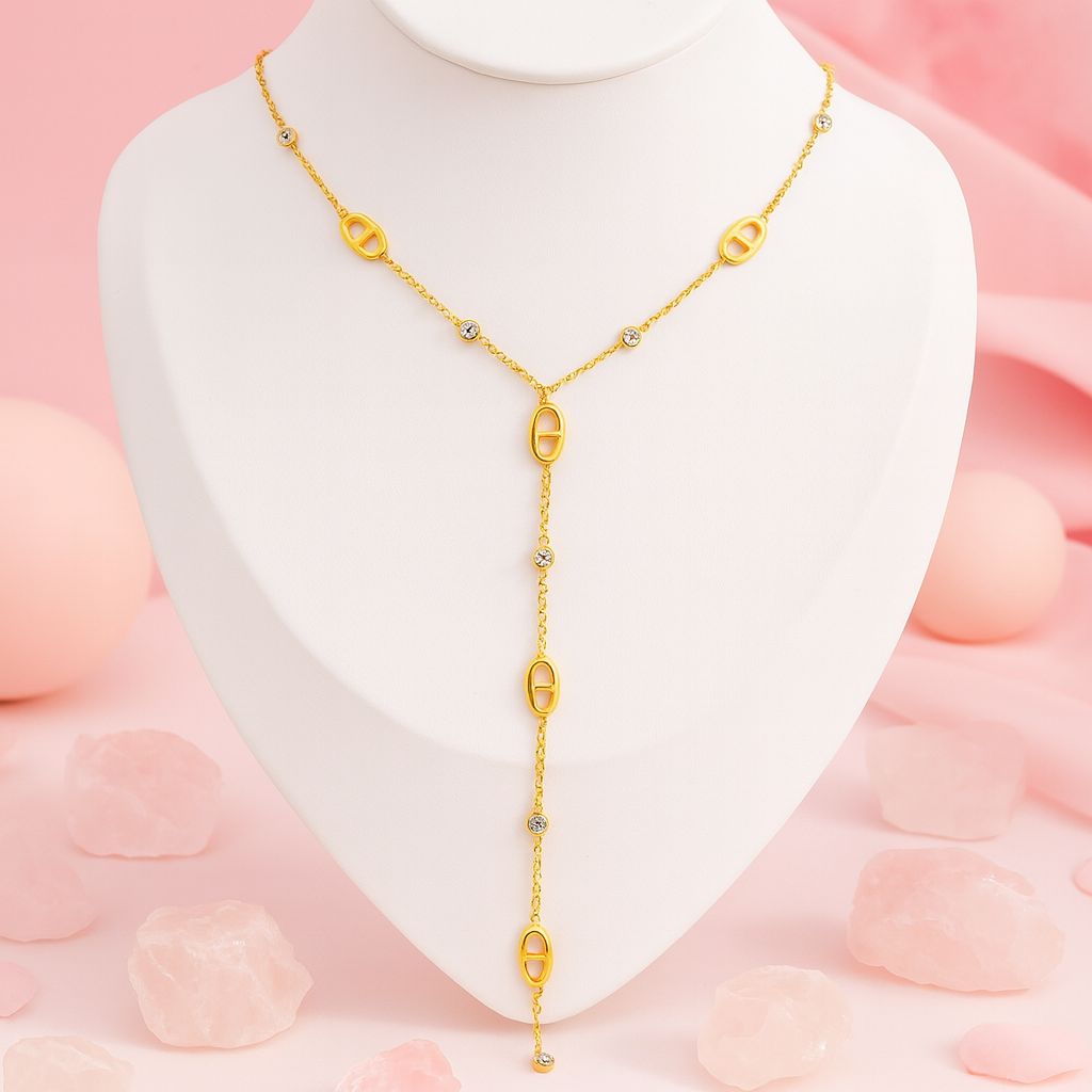 Minimaliste et raffiné, ce collier en titane doré alterne maillons ovales stylisés et zircons scintillants pour un éclat subtil. Sa finition or durable et sa légèreté en font un bijou élégant à porter seul ou en superposition.